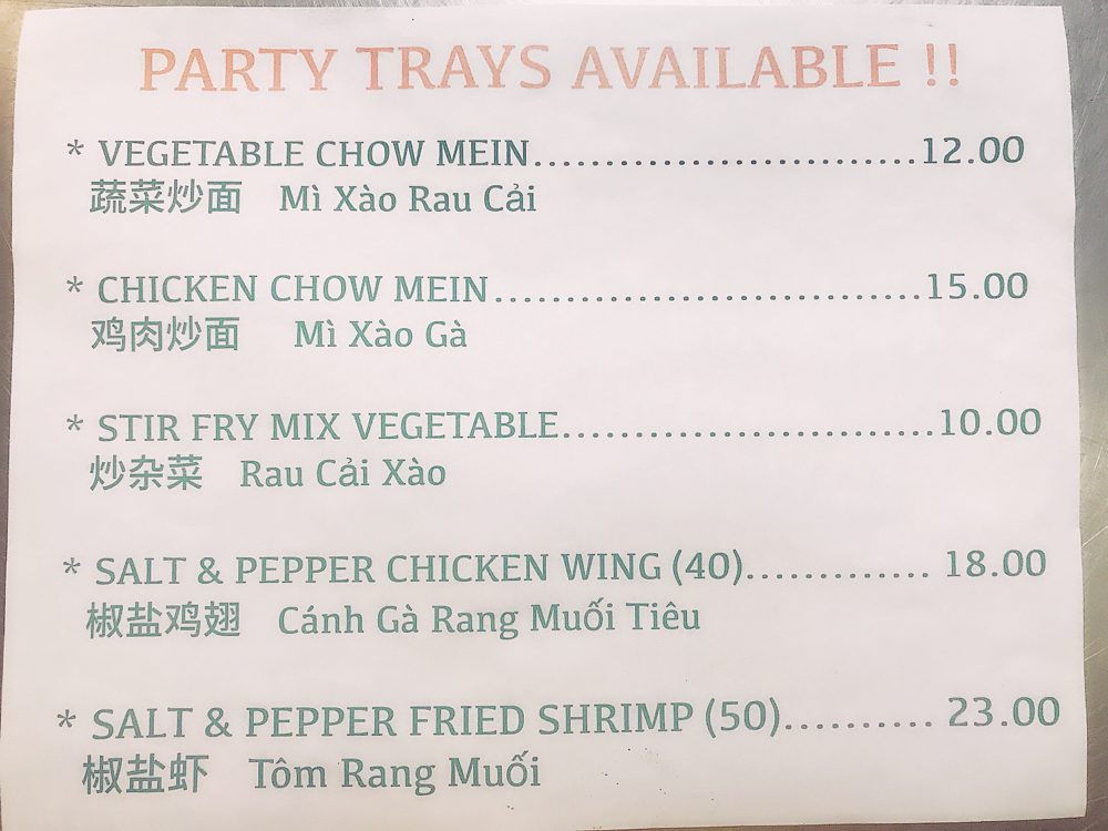 The friendly atmosphere and homey feel make you feel welcome, while regulars rave about the Salt & Pepper Fried Shrimp and flavorful Chow Mein. Whether you're after a quick meal or catering for a gathering with their affordable party trays, Nuoc Mia Vien Dong is a must-visit!